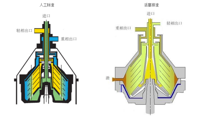 電機(jī)通過(guò)螺旋齒輪副驅(qū)動(dòng)轉(zhuǎn)鼓繞主軸軸線(xiàn)做高速旋轉(zhuǎn),在轉(zhuǎn)鼓內(nèi)形成強(qiáng)大的離心力場(chǎng)。物料由上部中心進(jìn)料管流入轉(zhuǎn)鼓底部,通過(guò)碟片分流孔趨向轉(zhuǎn)鼓壁空間。在離心力作用下,輕液沿錐形碟片外錐面向軸心流動(dòng)至上部由輕液口排出。重液沿碟片內(nèi)錐面趨向轉(zhuǎn)鼓壁流動(dòng)至上部的重液口排出。比液相重的固相物沉積向轉(zhuǎn)鼓內(nèi)壁形成沉渣,由排渣裝置自動(dòng)排出機(jī)外或停機(jī)后由人工清除。