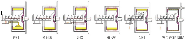電機(jī)帶動皮帶輪驅(qū)動轉(zhuǎn)鼓繞自身軸線高速回轉(zhuǎn),物料在預(yù)先編制的程序控制下,通過進(jìn)料系統(tǒng)進(jìn)入高速旋轉(zhuǎn)的轉(zhuǎn)鼓內(nèi)。在離心力的作用下,物料均布在過濾介質(zhì)上進(jìn)行脫液分離,液相透過固相物料和濾網(wǎng)縫隙,經(jīng)鼓壁孔甩至機(jī)殼空間,從出液口排出機(jī)外,固相物料截留在轉(zhuǎn)鼓內(nèi)形成濾餅。料層檢測裝置實時檢測物料的充填位置,當(dāng)濾餅達(dá)到事先設(shè)定的位置時,自動關(guān)閉加料閥,停止進(jìn)料,然后對濾餅進(jìn)行洗滌、脫水,待達(dá)到要求后,離心機(jī)降到卸料速度,卸料閥打開,刮料器在液動控制下旋轉(zhuǎn)上升,將濾餅刮下掉進(jìn)螺旋出料器,經(jīng)出料閥排出機(jī)外。